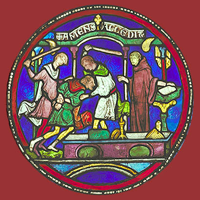 de Fordwich being brought under restraint and compulsion for a cure. From a window in north aisle of the Trinity Chapel, Canterbury Cathedral. Photo: © S. Alsford |